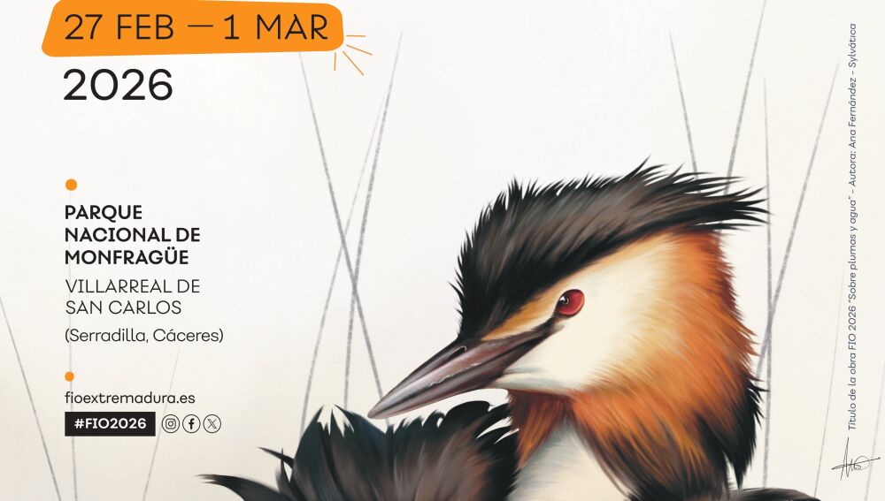 De hecho, el cartel de FIO 2026 es obra de la ilustradora extremeña Ana Fernández, que ha elegido como protagonista el somormujo blanco, una especie presente en Extremadura durante todo el año y cuya imagen refleja "belleza, delicadeza y también un mensaje poderoso", pues la autora ha querido lanzar "una reflexión sobre la necesidad de proteger humedales y ecosistemas frágiles", ha señalado Bazaga.