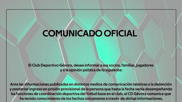"Desde el momento en que se tuvo conocimiento de esta situación, el CD Gévora ha procedido a la suspensión inmediata y total de cualquier relación y actividad de dicha persona con la entidad", ha asegurado el club pacense en un comunicado oficial publicado en redes sociales.