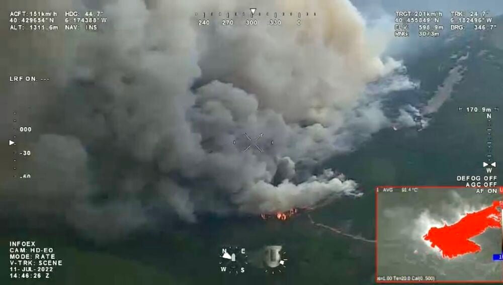 Además, las llamas han cruzado a la provincia de Salamanca, por lo que también están actuando en la extinción de este incendio efectivos de Castilla y León, donde la localidad más cercana a las llamas es La Alberca.