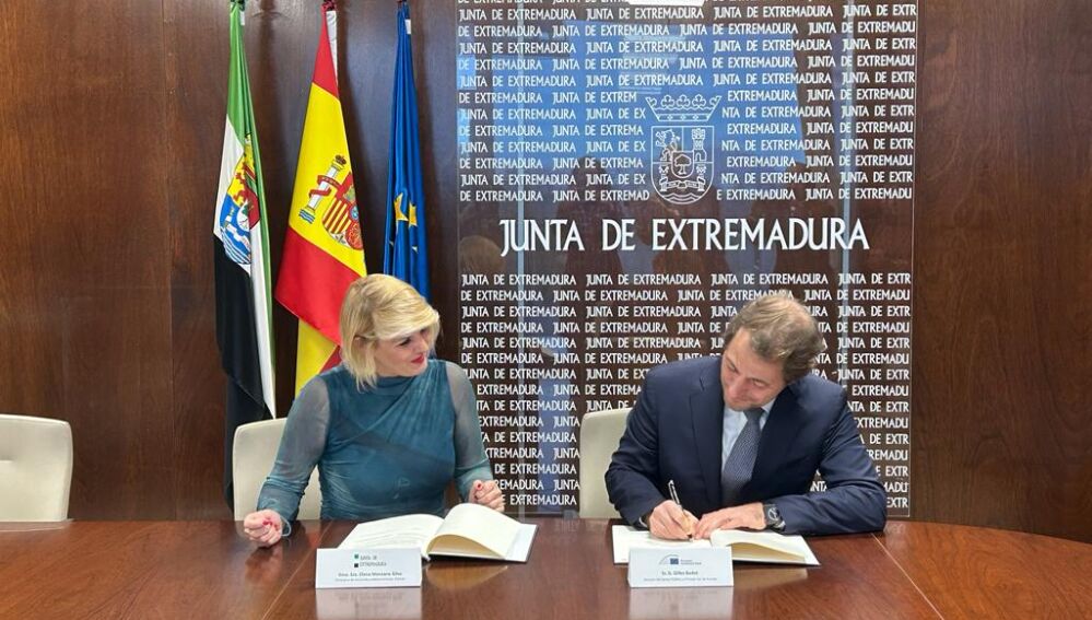 La consejera de Hacienda y Administración Pública, Elena Manzano, y el director del sector público y privado del Sur de Europa, Gilles Badot, han rubricado este viernes la firma de este contrato de financiación en Mérida.