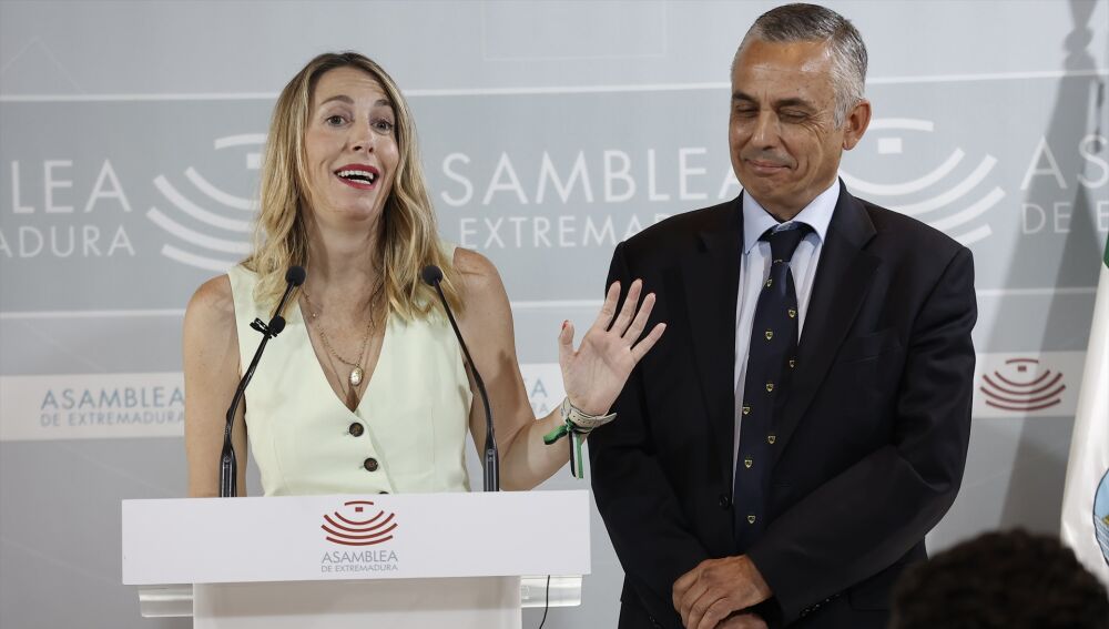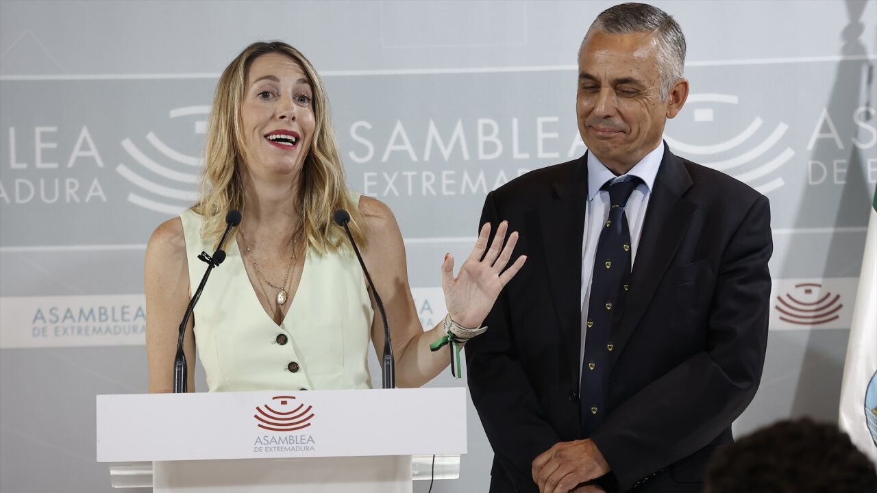 La presidenta del PP y de Extremadura, María Guardiola, ha comparecido junto al líder del Vox de la región, Pelayo Gordillo, para presentar el pacto de Gobierno de coalición que han firmado ambas partes y que incluye una consejería para el partido de Santiago Abascal.