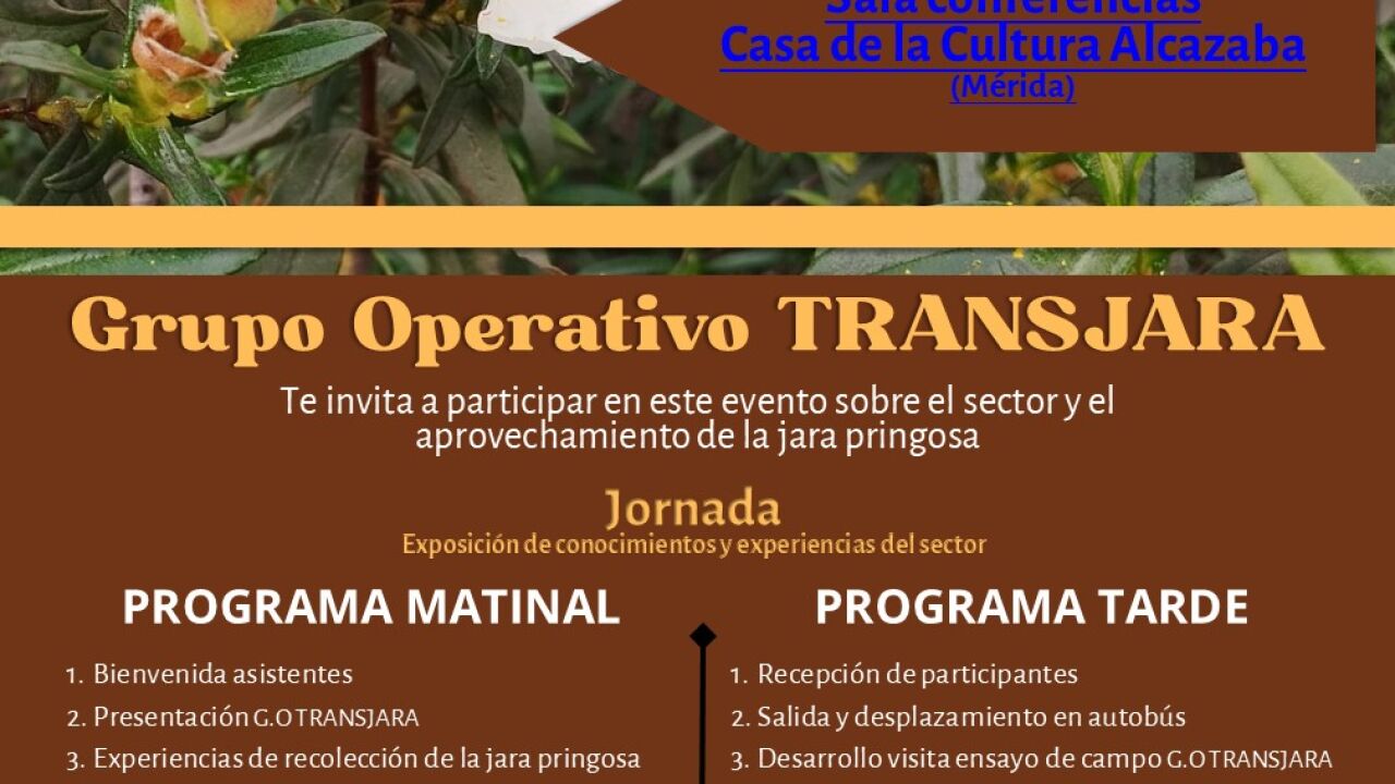 La Asociación para la Defensa de la Naturaleza y los Recursos de Extremadura (ADENEX), como entidad integrante del Grupo Operativo TRANSJARA, anuncia la celebración de la 1ª Mesa Interprofesional de la Jara Pringosa en Extremadura, que tendrá lugar el próximo 20 de octubre en la Sala de Conferencias de la Casa de la Cultura Alcazaba, en Mérida.