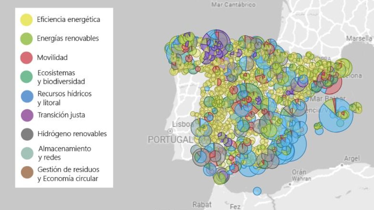 En cuanto a la ejecución de fondos en materia energética, el mapa recoge 29,60 millones de euros en autoconsumo, renovables térmicas residencial y almacenamiento; 19,70 millones de euros en los planes MOVES; 9,79 millones en impulso a la rehabilitación energética y a la disminución del consumo de energía final y de las emisiones de CO2 en el parque de edificios en municipios de reto demográfico (PREE) y 3,21 millones en renovables térmicas en industrias y servicios.