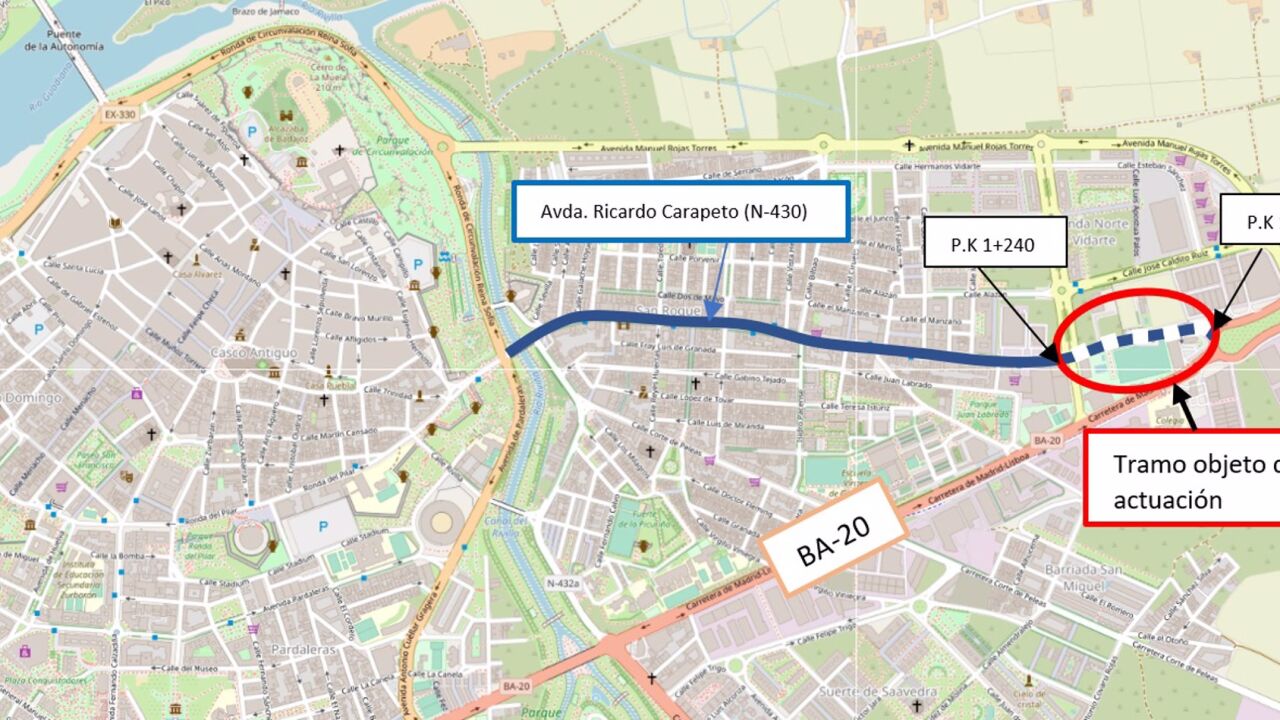 Las actuaciones proyectadas tienen lugar en Badajoz, en el tramo final de la Avda. Ricardo Carapeto, perteneciente a la carretera N-430, y se desarrollarán entre los puntos kilométrico 1,240 (intersección con la Calle Eugenio García Estop) y 1,540 (intersección con la carretera estatal BA-20).
