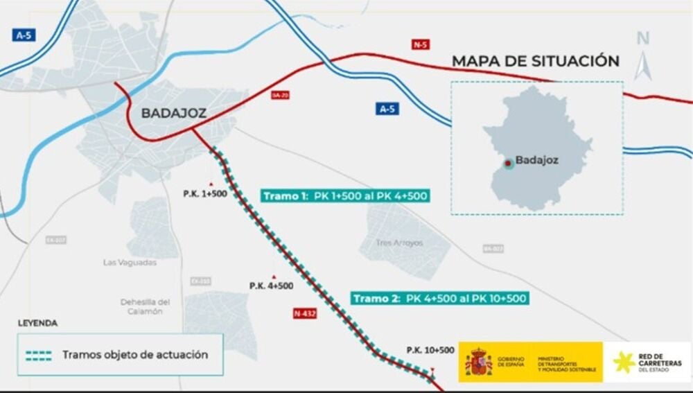 Cabe destacar que esta obras de acondicionamiento, reordenación y mejora del acceso sur de la N-432 al núcleo urbano de Badajoz constan de dos partes diferenciadas, como son por un lado, entre los kilómetros 1 y 4,66, en los que se duplicará la calzada de la carretera, se construirán cuatro glorietas y vías de servicios, y se reordenarán los numerosos accesos existentes.