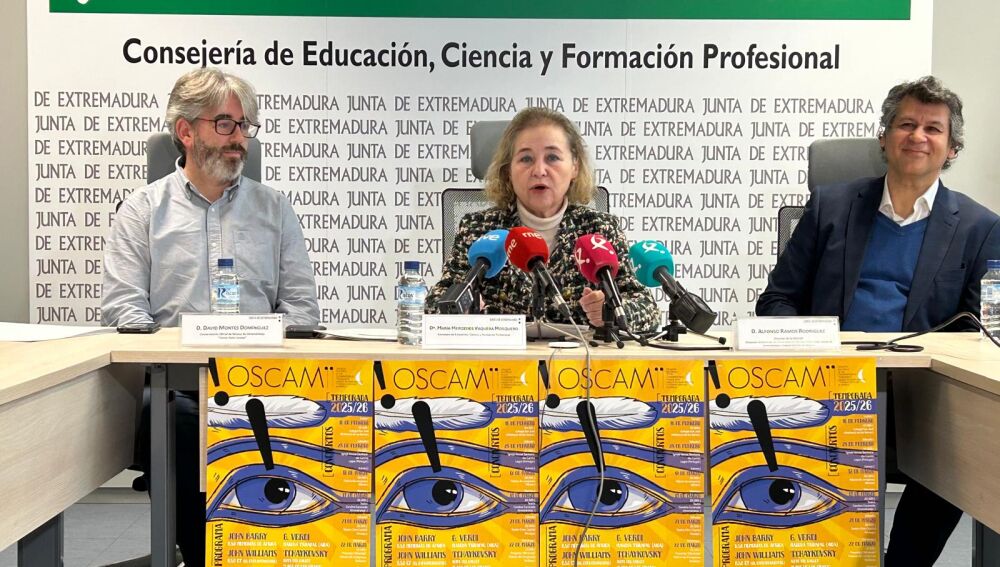 La consejera de Educación, Ciencia y Formación Profesional en funciones, María Mercedes Vaquera, ha presentado la nueva programación de la Orquesta Sinfónica de los Conservatorios de Almendralejo y Mérida (OSCAM), que se compone de seis conciertos en Extremadura y uno en Portugal para esta temporada 2025 - 2026.