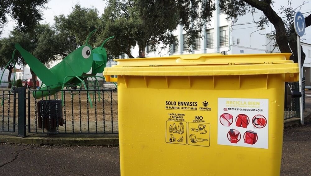 Promedio está instalando pegatinas en las contenedores amarillos de las localidades de la provincia de Badajoz que gestiona con el objetivo de indicar de forma gráfica los residuos que no se pueden tirar, como papel y cartón u objetos de plástico que no son envases.