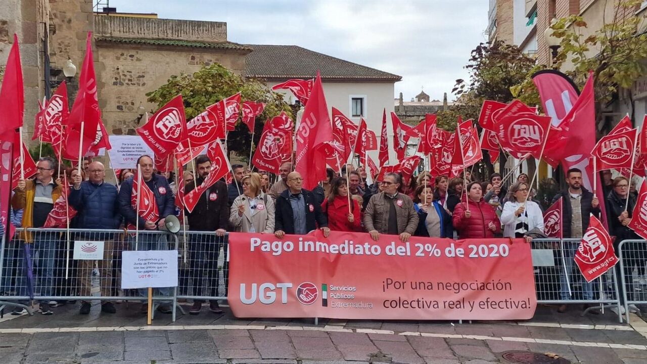 El sindicato UGT Servicios Públicos Extremadura ha reclamado que el Proyecto de Presupuestos Generales de la Comunidad Autónoma (PGEx) para 2025 incluyan el pago "inmediato" del 2% de subida salarial adeudado a 48.000 empleados públicos en un solo plazo.