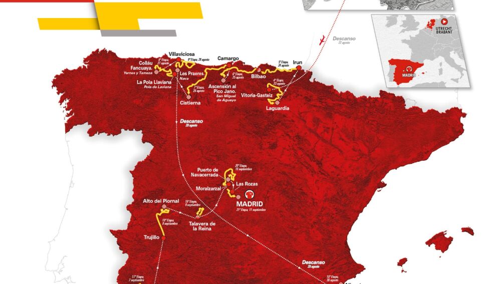 Unipublic daba a conocer ayer el recorrido de la próxima edición de La Vuelta Ciclista a España, que comenzará en la neerlandesa Utrecht el viernes 19 de agosto y concluirá el domingo 11 de septiembre en la capital tras más de 3.200 kilómetros con puertos nuevos, entre ellos los dos finales de etapa en Extremadura, en el Monasterio de Tentudía y el Alto de Piornal.