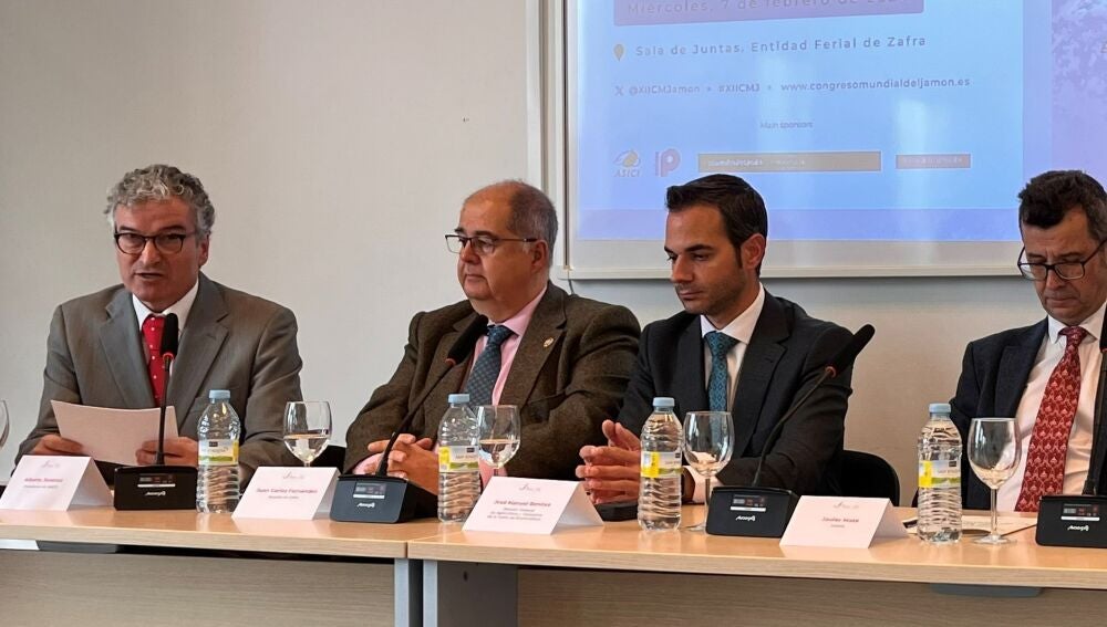 El director general de Agricultura y Ganadería, José Manuel Benítez, ha intervenido hoy en la presentación del XII Congreso Mundial del Jamón, que se desarrollará del 5 al 7 de junio, en el recinto de la Feria Internacional Ganadera de Zafra.