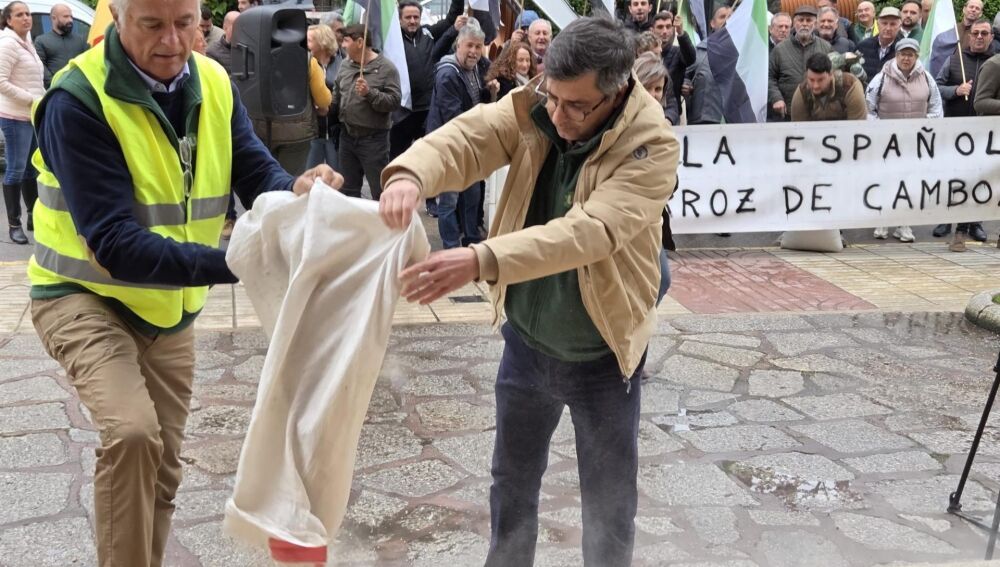 Una protesta en la que no se han visto banderas de las distintas organizaciones, pero sí de Extremadura, y que ha estado acompañada de una pancarta en la que se podía leer 'Paella española con arroz de Camboya' y de un lanzamiento de arroz ante las puertas de la Delegación.