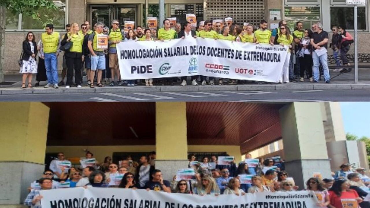 Representantes sindicales de PIDE, CSIF, ANPE, CCOO y UGT se han concentrado este miércoles frente a las Delegaciones Provinciales de Educación en Badajoz y Cáceres para pedir la homologación salarial de los docentes con el resto de las Comunidades Autónomas (CCAA), ya que Extremadura es "la segunda por la cola" en cuanto a retribuciones del personal docente.