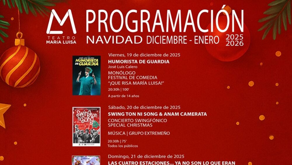 Por su parte, Amalia Pérez, coordinadora del teatro, añade que la oferta de Navidad incluye seis propuestas de gran formato con un "súper concierto" de la banda Swing Ton Ni Song, y montajes como Las cuatro estaciones, ya no son lo que eran, La fábrica de las maravillas o El Lago de los Cisnes, el gran ballet por excelencia y el más representado en la historia de la danza”.