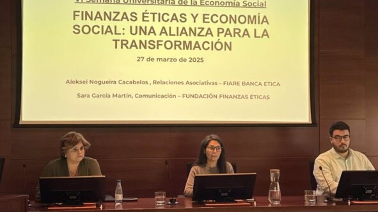 La mesa redonda ha contado con las intervenciones de Aleksei Nogueira Cacabelos, representante de Relaciones Asociativas en Fiare Banca Ética, y Sara García Martín, del área de Comunicación de la Fundación Finanzas Éticas. Ambos han expuesto la relevancia de las finanzas éticas en la construcción de una sociedad "más justa" y "sostenible".