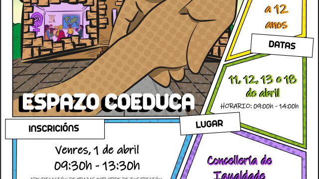 O Concello de Ourense abre este venres o prazo para anotarse no programa de actividades de lecer infantil do programa Coeduca, destinado a rapaces e rapazas de 6 a 12 anos, e que se desenvolverá os días 11, 12, 13 e 18 de abril en horario de 9:00 a 14:00 horas.