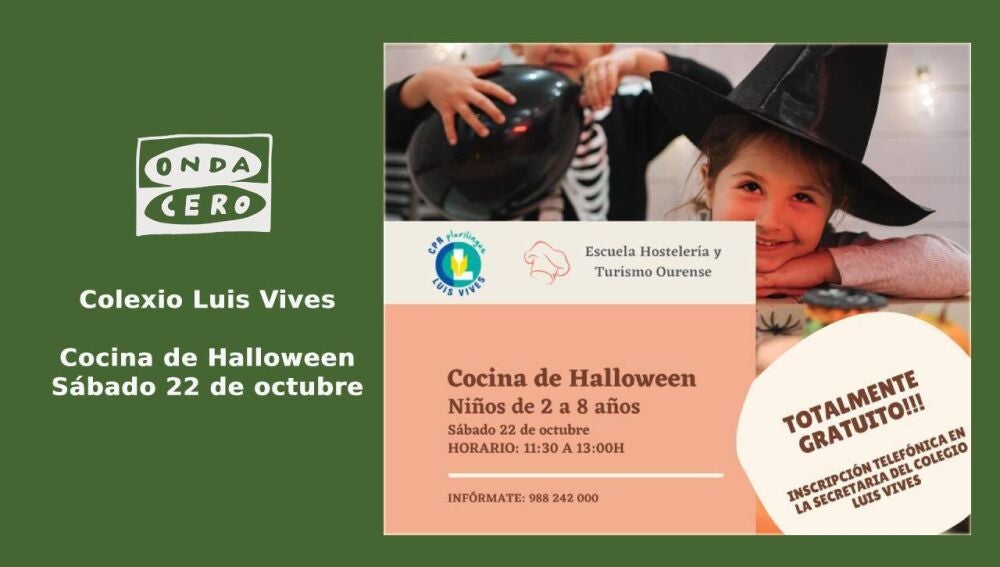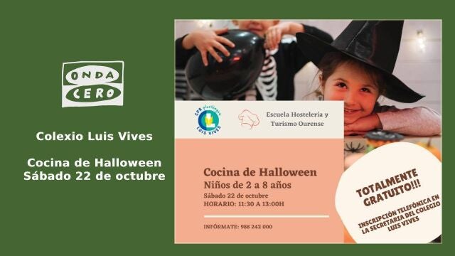 O sábado 22 de outubro de 11:30 a 13:00 horas haberá actividades de balde para nenos e nenas de 2 a 8 anos sobre "Cocina de Halloween" no Colexio Luis Vives.