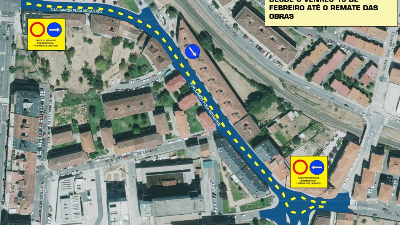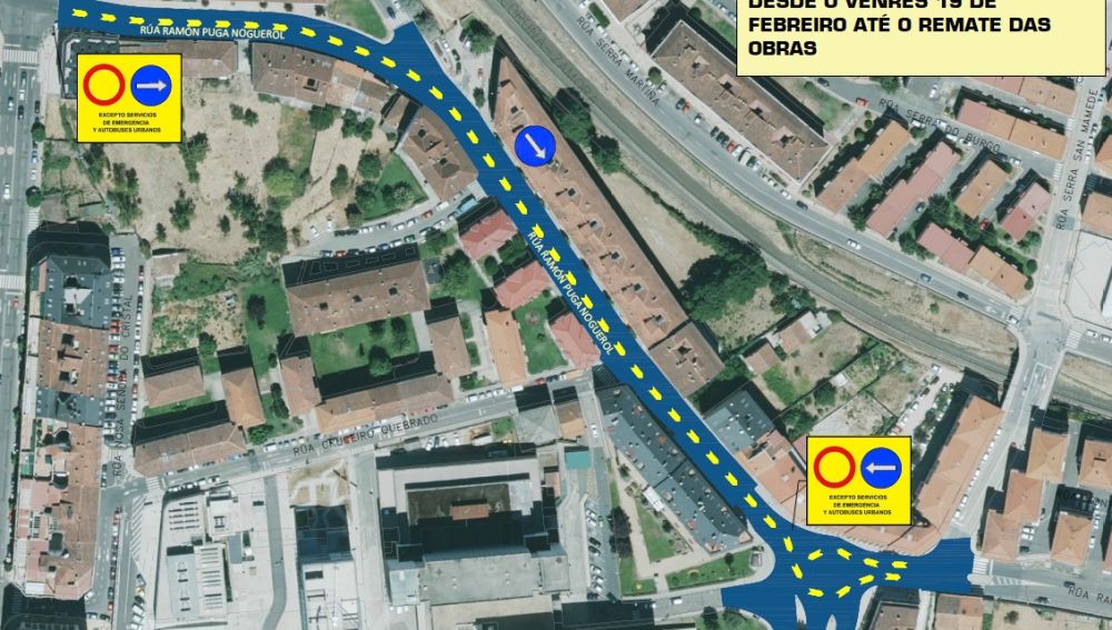 O xoves 18 de febreiro comezaranse os traballos na rúa Álvaro Cunqueiro, e ao finalizar as actuacións nesta rúa continuarase na rúa Ramón Puga. Desde este día, a rúa Ramón Puga será de dirección única de subida para todos os vehículos, dende a intersección coa rúa da Saínza ata a zona do Complexo Hospitalario. Non estará permitida a circulación de vehículos no sentido de baixada, dende a zona da residencia ata a rúa Xosé Cornide, excepto para os autobuses urbanos e os vehículos de emerxencias.