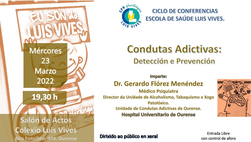 O vindeiro mércores 23 de marzo ás 19:30 horas terá lugar a IV Conferencia dentro do ciclo "CONFERENCIAS ESCOLA DE SAÚDE LUÍS VIVES" no Salón de Actos do Colexio Luis Vives baixo o título "Condutas aditivas: detección e prevención".