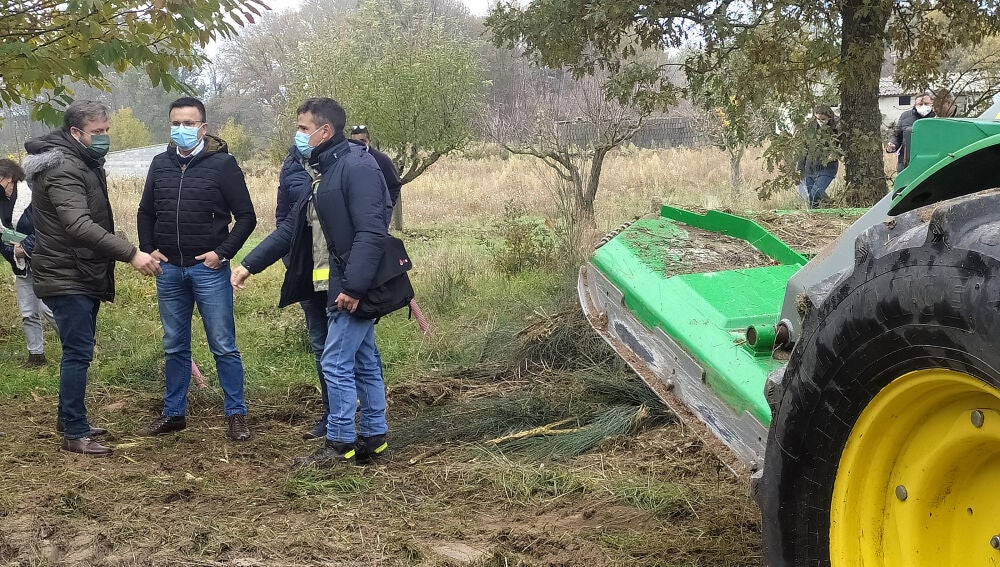 O conselleiro do Medio Rural, José González, e o director xeral de Defensa do Monte, Manuel Rodríguez, supervisan as execucións subsidiarias de xestión da biomasa que se están levando a cabo nos concellos ourensáns de Cualedro e Monterrei. Uns traballos nos que a Xunta investirá preto de 260.000 euros co obxecto de deixar limpas de maleza e de arborado prohibido pola Lei de incendios (piñeiro, eucalipto e acacia) case 100 hectáreas situadas en franxas secundarias, isto é, nos 50 metros máis próximos ás vivendas.