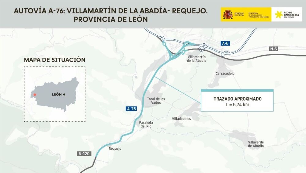 O Ministerio de Transportes ven de aproba-lo proxecto para a construcción do primeiro tramo da A-76 entre as localidades leonesas de Villamartín de la Abadía e Requejo. Para elo o Ministerio investirá 131,7 millóns de euros.