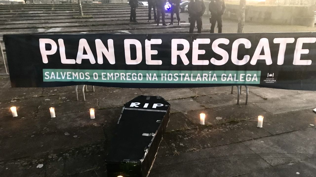 La movilización de la Hostelería fue convocada por Hoempo, sumándose así a la iniciativa de la Plataforma Na Defensa da Hosteleria Galega que se desarrolló simultáneamente en veinte municipios de la comunidad, partió del edificio de la Xunta en Pontevedra. Formando una caravana fúnebre denunciaron la agonía de muchos negocios que no resisten más la actual situación. Aseguran que las medidas decretadas por los gobiernos autonómico y central han criminalizado a un sector intervenido porque "no puede continuar con su actividad".