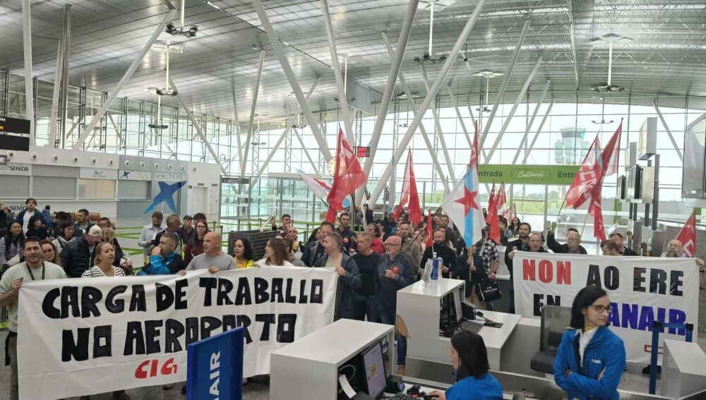 Trabajadores de Ryanair protestan en el Aeropuerto de Santiago contra el ERE presentado por la compañía aérea