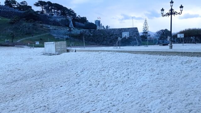 El fuerte temporal de viento y lluvia que ha afectado a toda la comarca de Vigo en las últimas horas se ha saldado sin consecuencias importantes, más allá de árboles caídos y olas de entre 6 y 7 metros de altura. La fuerza del mar ha provocado que la espuma invadiera algunos tramos de la carretera entre Baiona y A Guarda y nos dejase esta imagen del parque de A Palma.