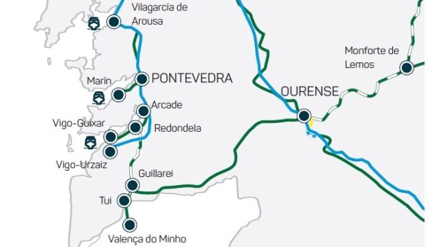 El Ministerio de Transportes sigue apostando por la línea del Miño. Mejorar su calidad, reducir tiempos y a la vez avanzar en la conexión con Portugal. Algunos expertos señalan que una reducción en el tiempo de viaje entre Vigo y Ourense, hasta dejarlo en el entorno de los 50 minutos de viaje, supondría una alternativa más viable y cómoda que el trazado ( norte) por Cerdedo, envuelto desde hace años en estudios ambientales y geológicos y que supondría una inversión multimillonaria para ahorrar poco más de 15 minutos sobre el tiempo que se tarda ahora en llegar a Ourense, dando la vuelta por Santiago.