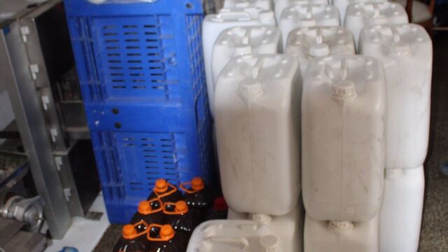 Se contabilizaron un total de 1048 envases llenos y vacíos, de 5 y de 25 litros, que en la mayoría de los casos habían sido reutilizados. En el local se localizó una zona de 'lavado' con un fregadero donde el propietario reutilizaba los envases lavándolos a mano.
