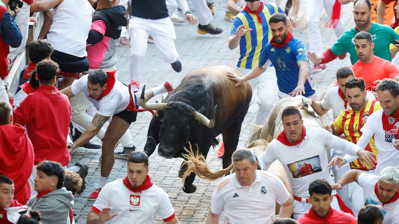 Han sido tres minutos menos que el encierro de ayer que duró más de cinco porque uno de los toros se separó del resto. Los toros, en su mayoría castaños, han salido estirados y durante el recorrido han cambiado de posición continuamente debido a las continuas caídas de corredores y astados, sin llegar a perder el ritmo. De hecho, uno de los toros ha enganchado a un mozo por la ropa.