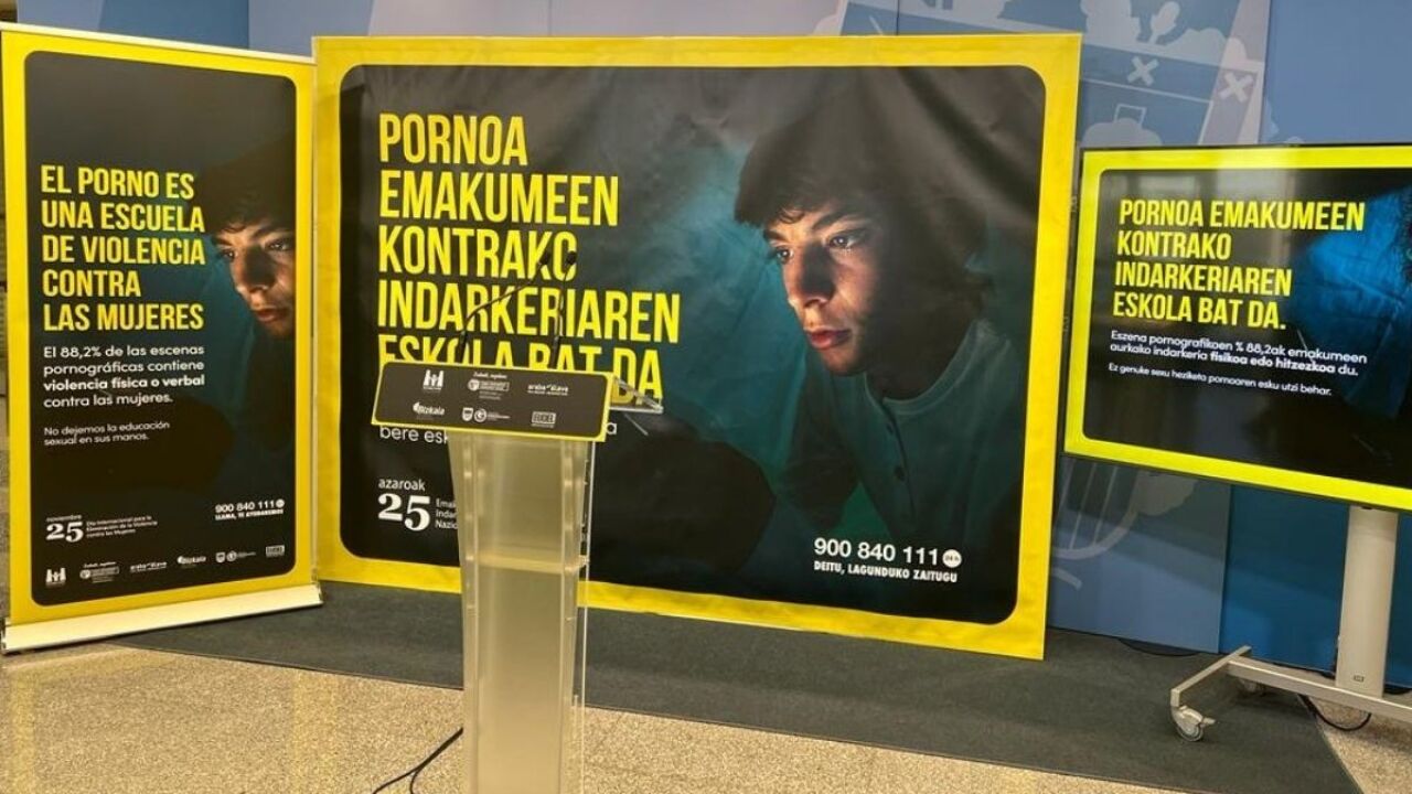 El departamento vasco de Igualdad, Justicia y Políticas Sociales, a través de Emakunde; las diputaciones forales de Araba, Bizkaia y Gipuzkoa; y EUDEL firman este año una campaña conjunta que pretende advertir a la sociedad del peligro de dejar la educación sexual de la juventud en manos de la pornografía. El lema de la campaña de este año del 25-N es “El porno es una escuela de violencia contra las mujeres”, un lema que hace referencia a datos preocupantes como que la edad en la que los niños comienzan a consumir pornografía se sitúa en los 12 años o que el 88,2% de las imágenes pornográficas que visualizancontienen violencia física o verbal contra las mujeres reforzando , de este modo, la masculinidad violenta y dominante y una feminidad complaciente y sumisa en detrimento de unas relaciones sexuales sanas. Además el 34% de los jóvenes reconocen que el porno influye mucho en sus relaciones sexuales y afectivas.