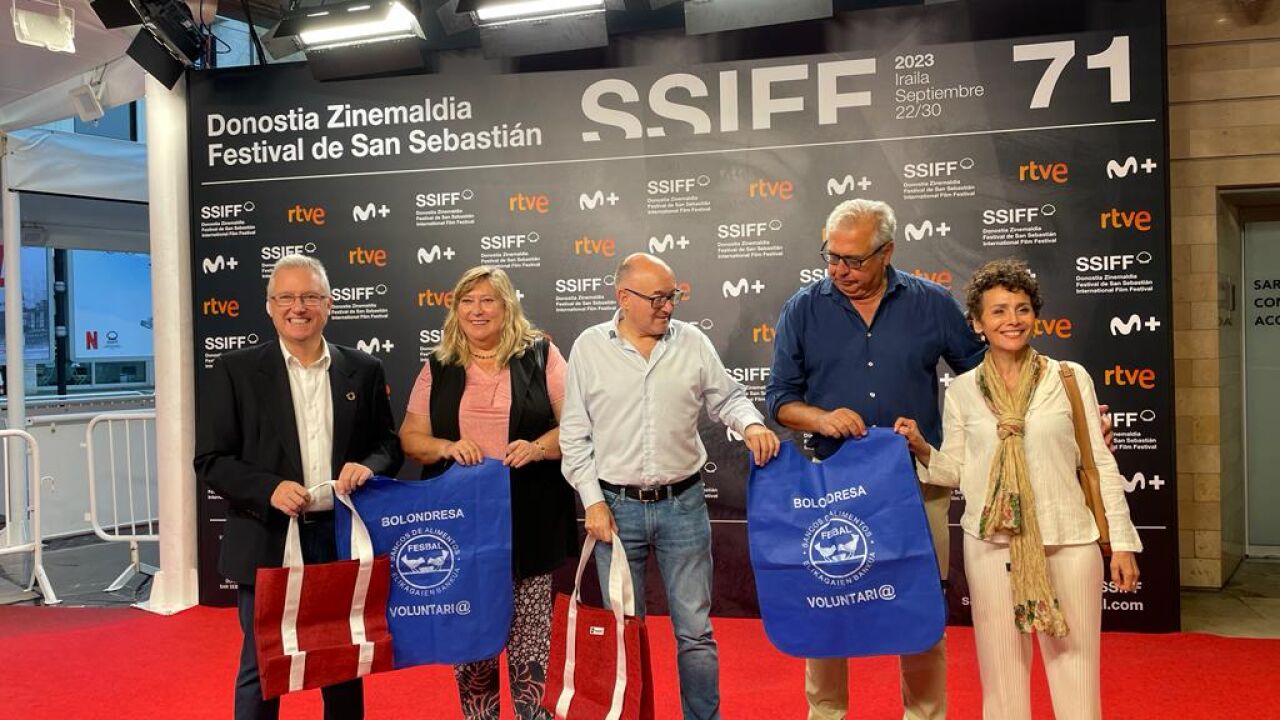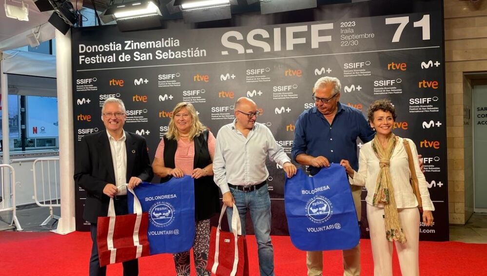 Quizá las estrellas que están llegando a San Sebastián no lo sepan, pero la alfombra roja que pisan con zapatos carísimos y vestidos de alta costura y trajes de sastrería ayudará a cientos de personas que en Gipuzkoa siguen pasando hambre, ya que esa moqueta se convertirá en mil bolsas para que el Banco de Alimentos pueda utilizarlas en su labor.