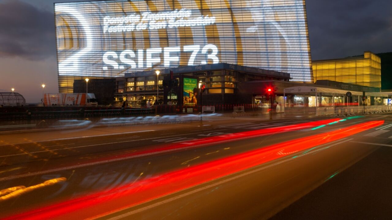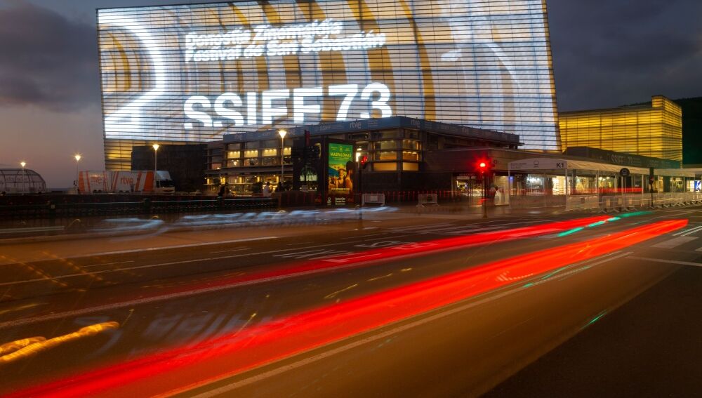 El Kursaal iluminado con el cartel oficial de la 73 edición del Zinemaldia | Festival Internacional de Cine de San Sebastián