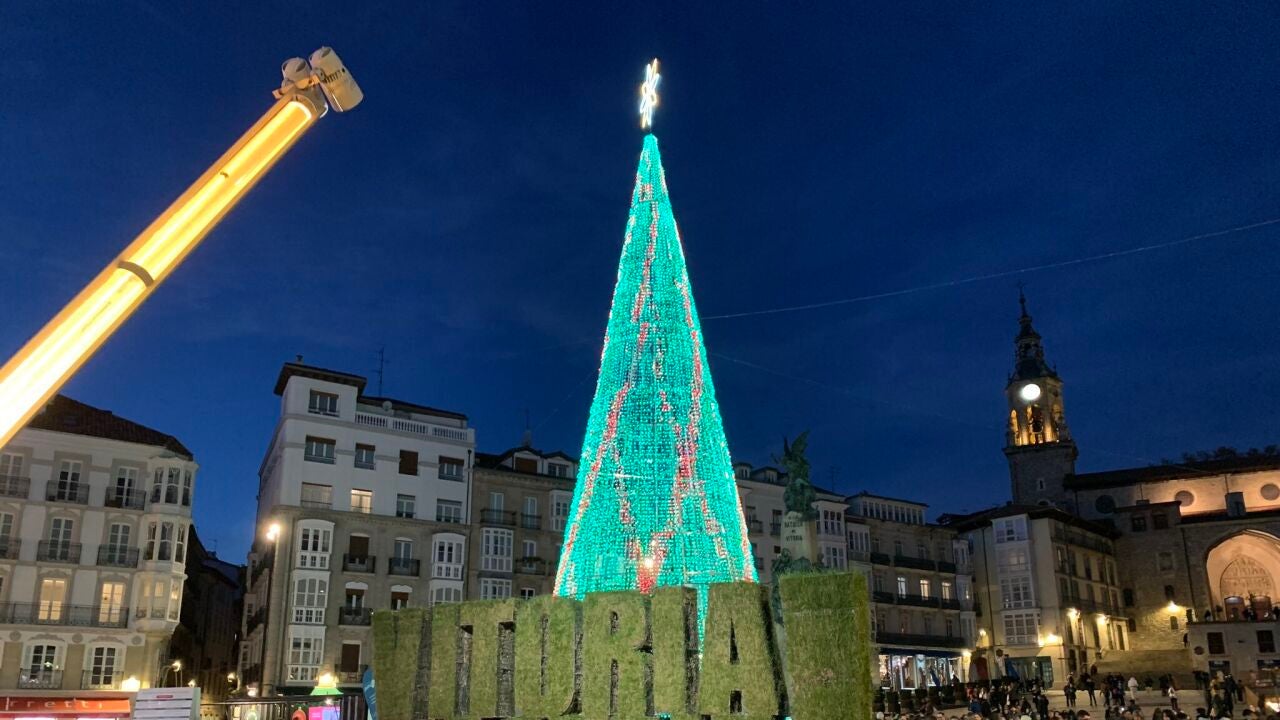 Un árbol de 21 metros en la Plaza de la Virgen Blanca será el mayor atractivo de la iluminación navideña en Vitoria este 2023. Este árbol ofrecerá cada hora un espectáculo de música y luz.