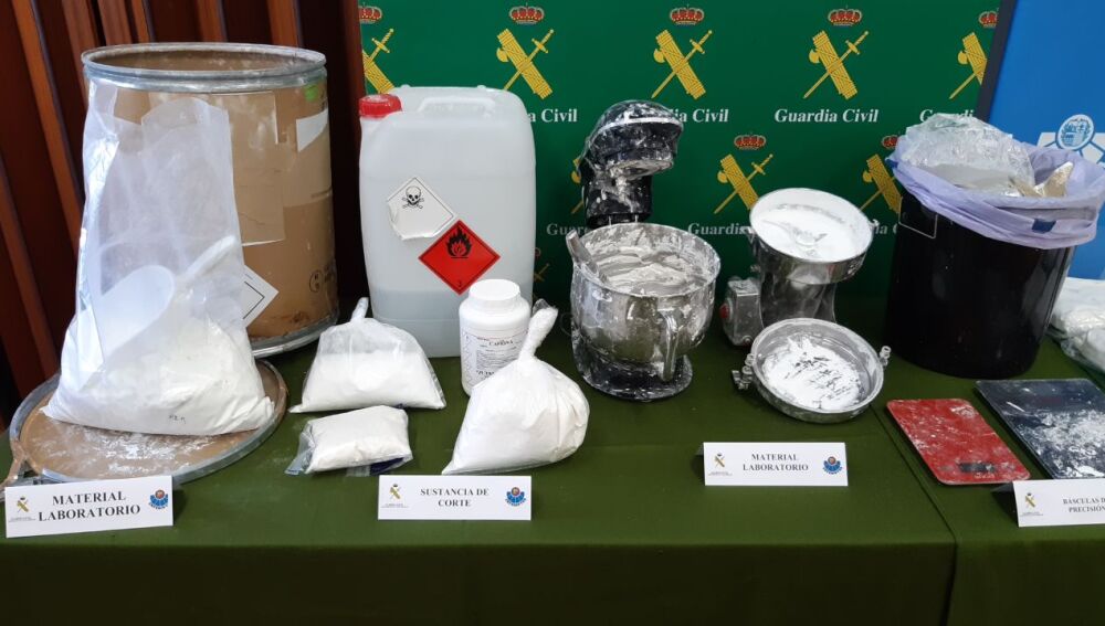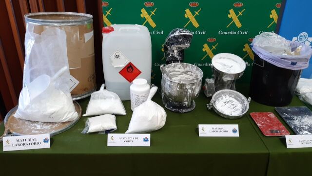 Siguiendo órdenes judiciales, se procedió a la entrada y registro de diferentes domicilios, un garaje cerrado y un trastero presuntamente utilizado como laboratorio para la elaboración de sustancias sintéticas (sulfato de anfetamina).