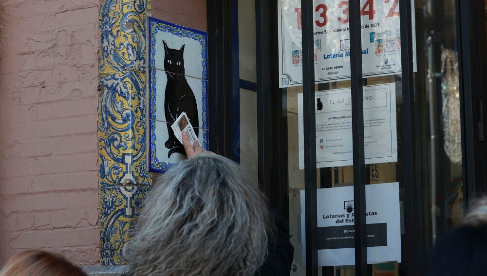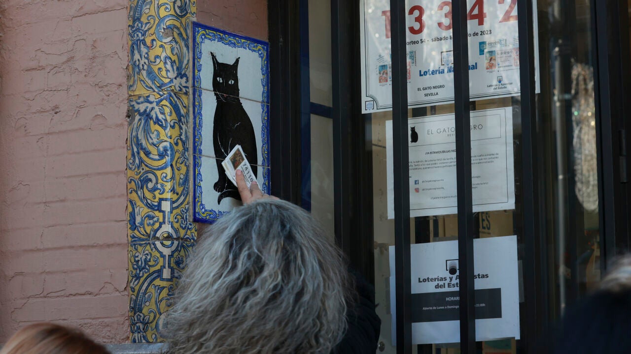 En la Administración de Loterías del Gato Negro de Sevilla, los supersticiosos frotan el décimo por la imagen del gato que hay en la entrada.