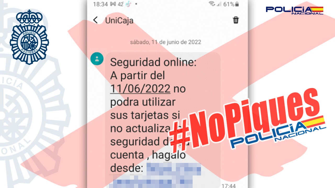 "Si recibes un SMS de tu banco diciendo que no puedes utilizar tus tarjetas hasta que no actualices tu cuenta, no piques" ha informado la cuenta oficial de Twitter de la Policía Nacional. Este fraude forma parte de un caso de phishing, mediante el cual el usuario se ve atraído a pinchar en una serie de enlaces.