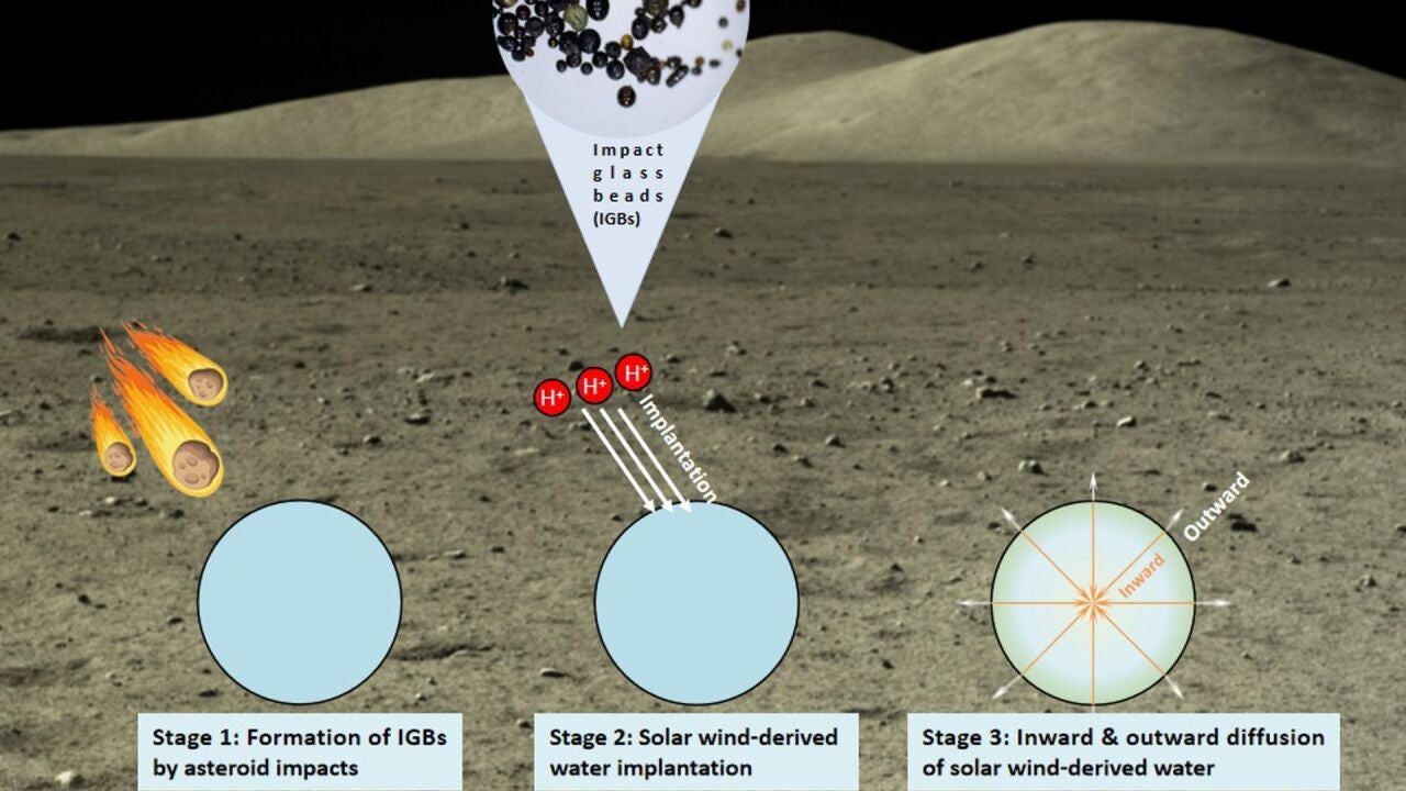 Ahora, los estudios detallados muestran que estas perlas de vidrio son probablemente un nuevo depósito de agua en la Luna, que registra la entrada y salida dinámica de agua derivada del viento solar y actúa como amortiguador del ciclo del agua en la superficie lunar.