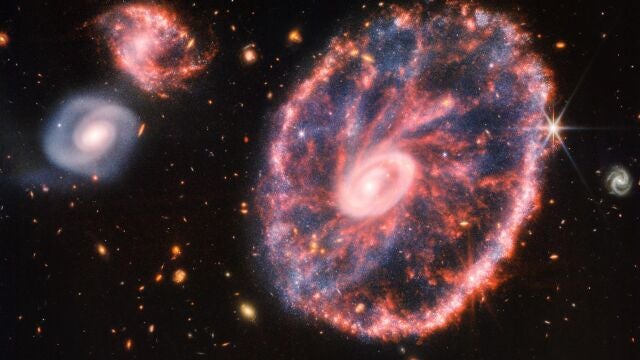 Esta peculiar galaxia no se muestra sola. La potente mirada infrarroja del Webb ha logrado una instantánea detallada de Rueda de Carro, pero también de dos galaxias compañeras más pequeñas con un telón de fondo de muchas otras galaxias. La instantánea, que también revela el comportamiento del agujero negro dentro del centro galáctico de la galaxia, proporciona una nueva visión de cómo esta ha cambiado a lo largo de miles de millones de años, señalan en sendas notas de prensa la estadounidense NASA y la Agencia Espacial Europea (ESA).