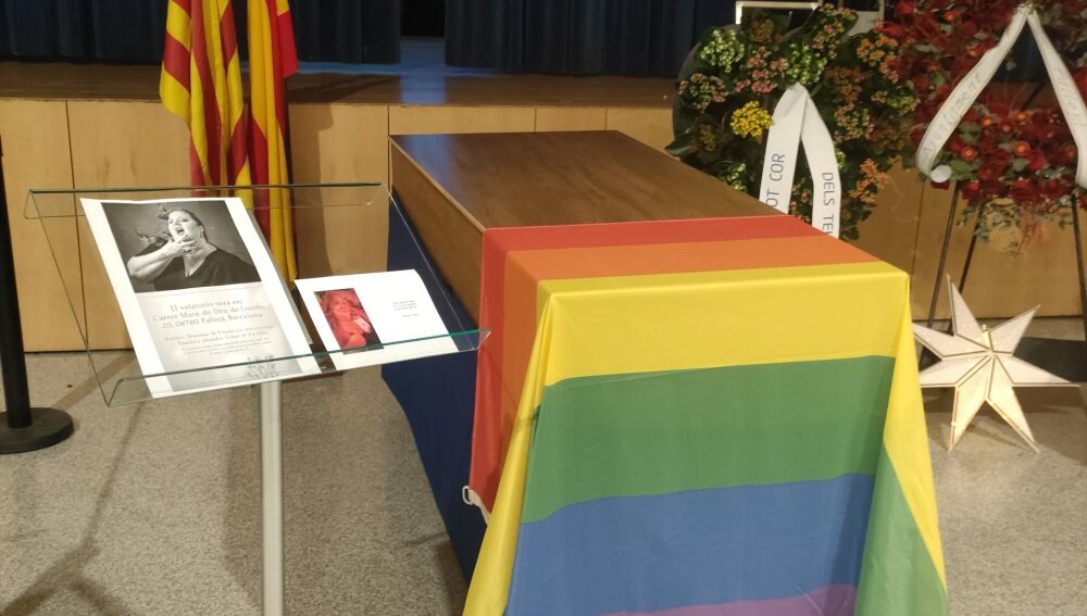 Una bandera LGTBI cuelga de un extremo del ataúd, que está situado ante una bandera de Cataluña y otra de España, ubicadas en el fondo.