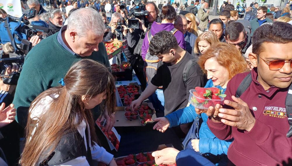 Los agricultores reparten mil kilos de fresas de Huelva en la Puerta del Sol | Laura Lorenzo