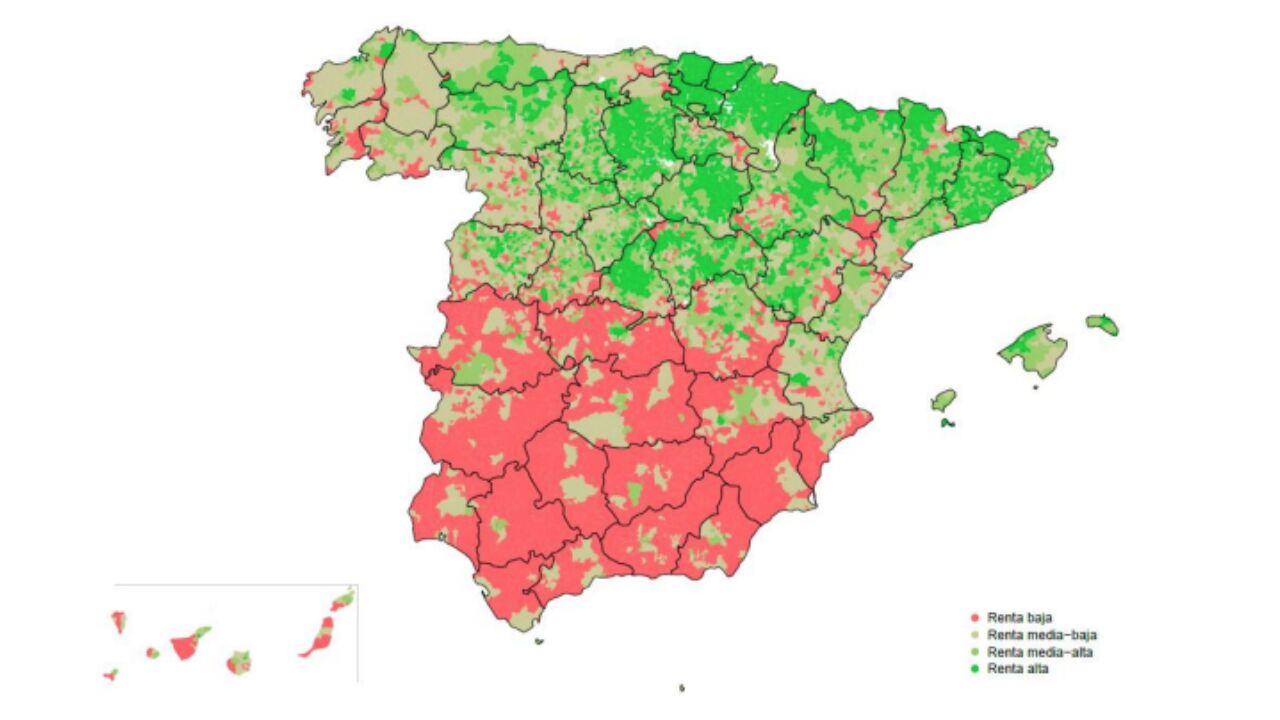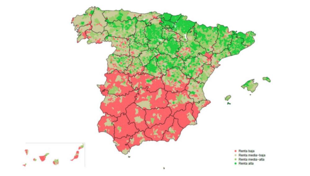 Aunque el informe arroja también datos muy llamativos que demuestran que se mantiene la brecha entre el Norte y el Sur. Por ejemplo, casi el 85% de los municipios del País Vasco son de renta alta. Le sigue la Comunidad Foral de Navarra (con el 66%) o Cataluña (con el 44%). En estas CCAA, los municipios que se clasifican de renta baja no llega ni al 1% en el caso de los vascos, ni al 2% en el caso de los navarros, ni al 3% en el caso de los catalanes.