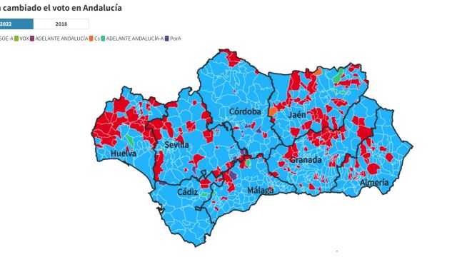 Con estos datos, el mapa electoral andaluz se ha teñido por completo de azul, mientras que anteriormente siempre dominaba el rojo del PSOE.