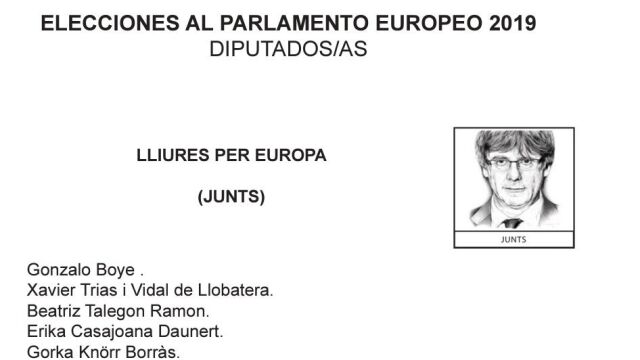 En la fotografía puede verse el nombre de la candidatura de JxCat, denominada "Lliures per Europa (Junts)", en cuya parte superior derecha aparece un dibujo de Puigdemont y en la parte inferior la lista, encabezada por Gonzalo Boye, Xavier Trias y Beatriz Talegón.