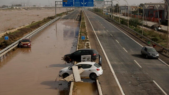 Vista general de la CV-30, en Valencia, cortada por las intensas lluvias. | EFE/Biel Aliño