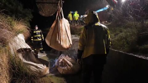 La UME ha difundido imágenes de las misiones realizadas esta madrugada en la mina Los Frailes, en Sevilla, construyendo un muro de contención con Hesco Bastión y maquinaria pesada.