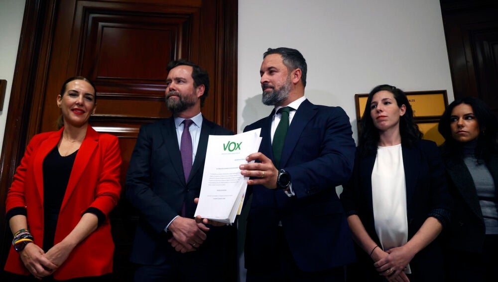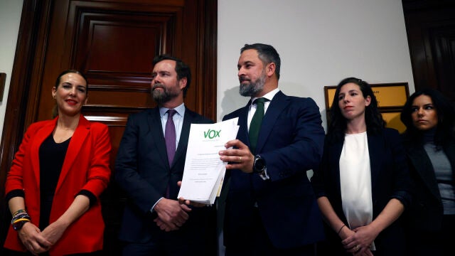 El líder de Vox, acompañado de varios diputados, registra en el Congreso el escrito que activa su intento de desalojar a Sánchez. Dice que desearía que la moción se debata lo antes posible para que en tres meses la convocatoria a urnas sea para municipales, autonómicas y generales. Todo, pese a que admite que solo pretende retratar al Gobierno.