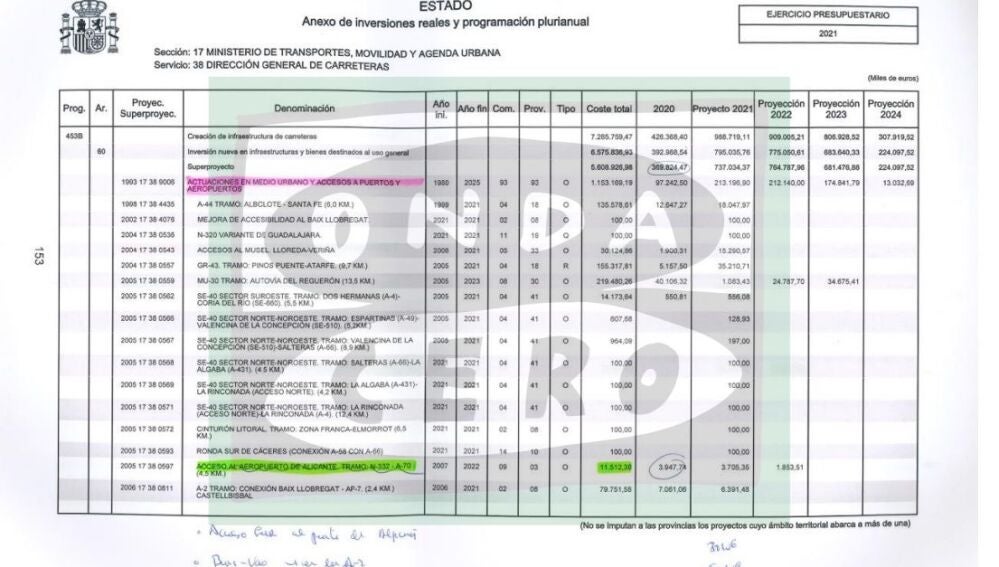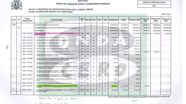 Aldama ha incluido en su testimonio "una relación de obra pública, pre-adjudicada, que se licitaría conforme a los Presupuestos Generales del Estado correspondientes al año 2021, fundamentalmente por la Dirección de Carreteras". Según señala, el documento "contiene anotaciones manuscritas que pueden corresponder con la letra de José Luis Ábalos, quizás de Koldo García, sin poderlo afirmar con seguridad". En su escrito, aclara que "se aporta el documento original a los efectos de comprobación que sea oportuna".