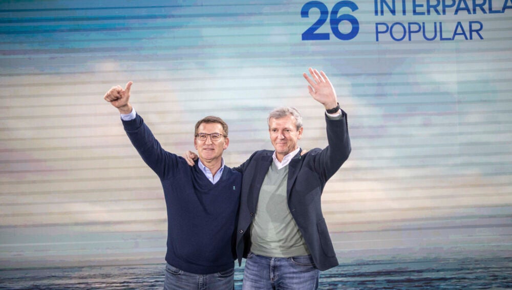 El presidente del PP, Alberto Núñez Feijóo (i) y el presidente del PP de Galicia, Alfonso Rueda, este domingo durante la clausura la XXVI jornada interpalamentaria 'Cumplir con la palabra'en Ourense. | EFE/ Brais Lorenzo