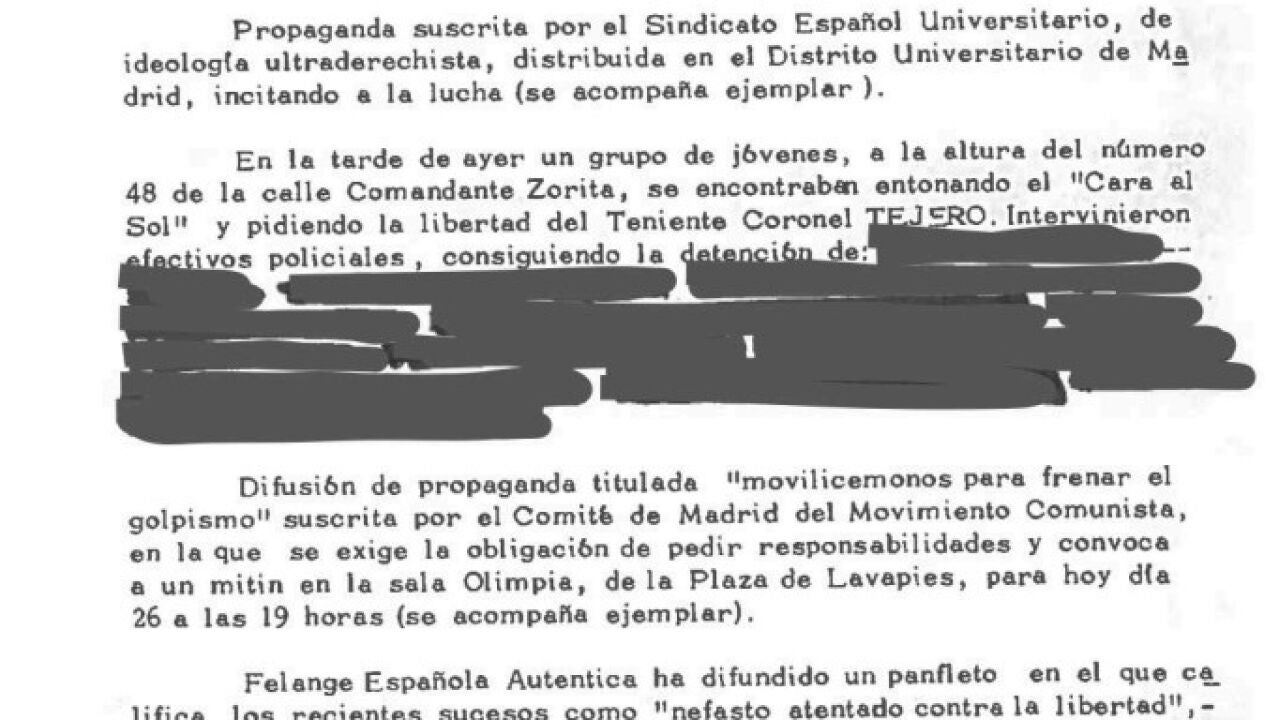 Los documentos desclasificados del 23F incluyen tachones que ocultan nombres relacionados con el golpe